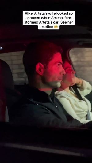 成固定景点了🤣阿尔特塔驾车被球迷堵住,妻子翻白眼无奈扶额