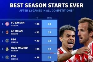 1.拜仁慕尼黑 (2025/26赛季),+38净胜球,13胜