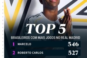 维尼修斯追平卡塞米罗,成为皇马队史出战比赛第3多的巴西球员,位居他身前的是马塞洛(546场)以及卡洛斯(527场),罗德里戈以281场位居第5。